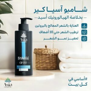 شامبو آسيا كير هيالورونيك معمول مخصوص للشعر المعالج كيميائياً. تركيبة الهيالورونيك + البروتين بتساعد على إعادة بناء الترطيب الداخلي وتقوية الشعرة من غير ما تنشفها، لأنه خالي من السلفات القاسية.